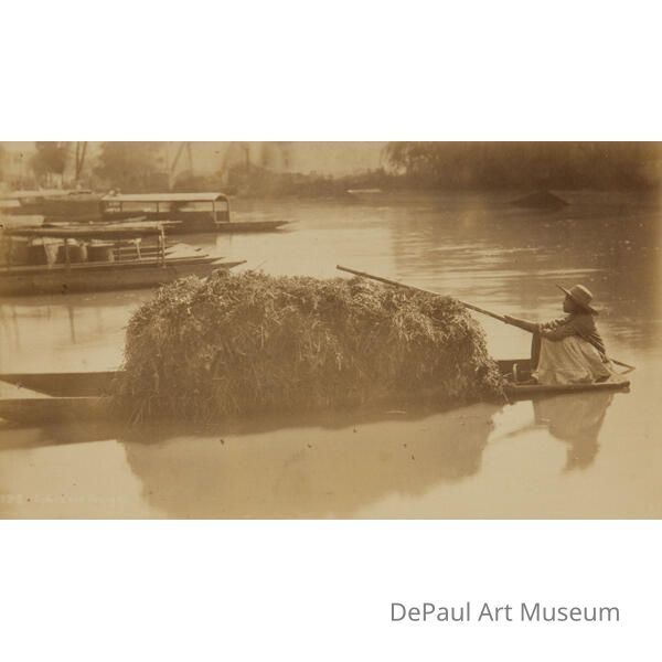 Man in a long wooden boat with large bale of hay floating on a body of water