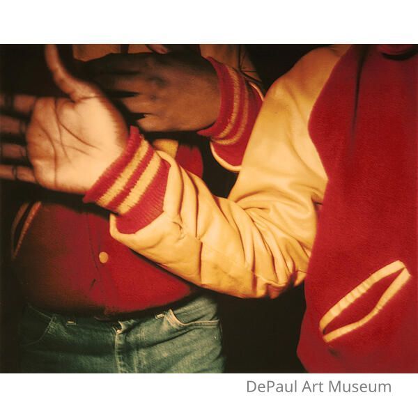 Two African American torsos wearing yellow and red varsity jackets, with one holding an arm out in front of the other.Acquisition