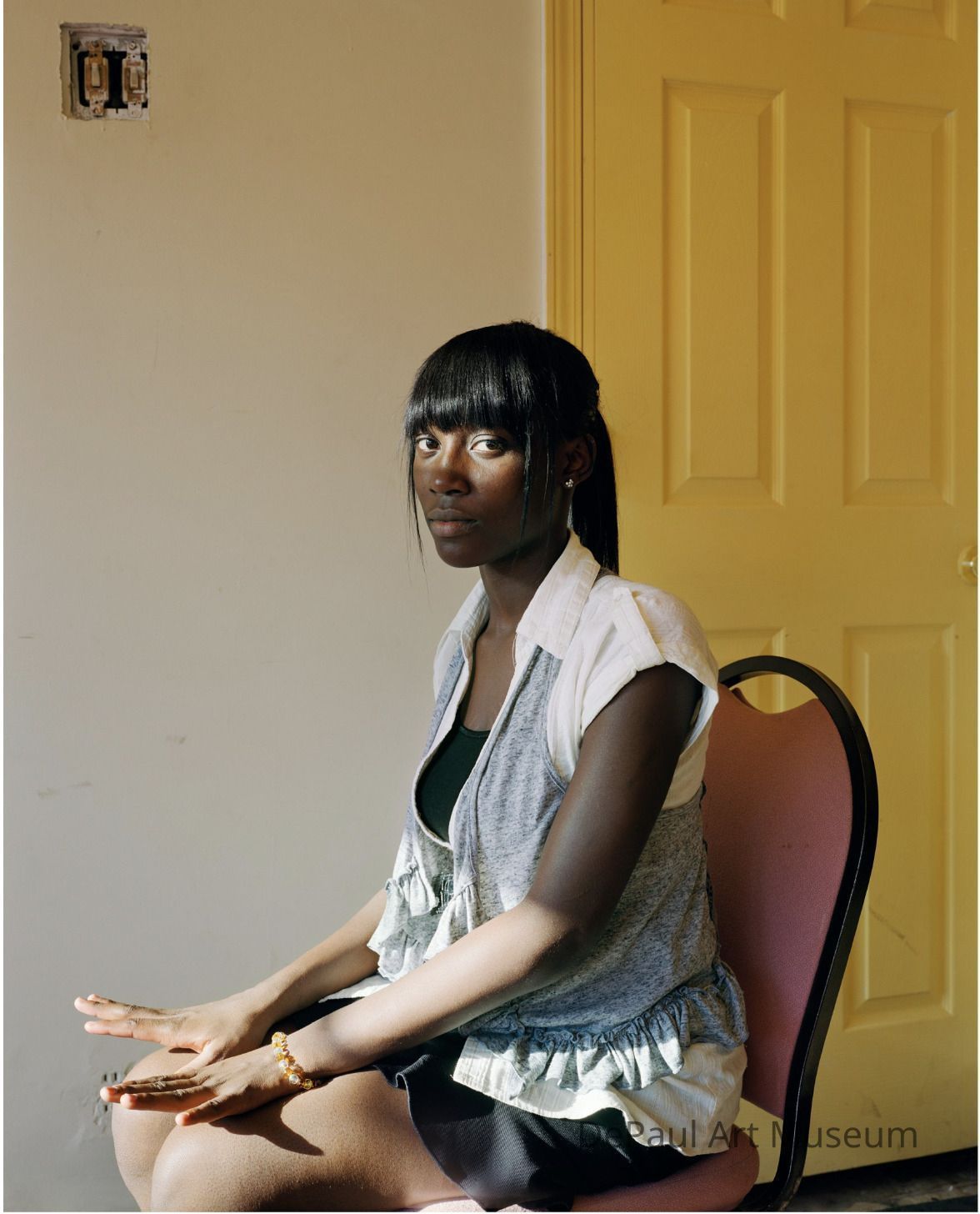 Young African-American woman sitting on red-cushioned chair in front of a yellow door and white wall with her fingers flexed.Acquisition