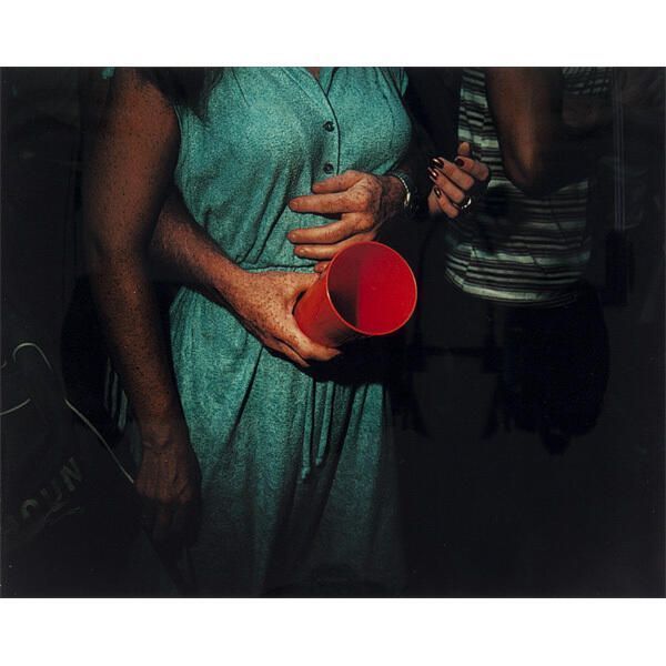 Close-up of woman's torso and lower body wearing teal dress with two arms wrapped around her, one holding red cup.Acquisition