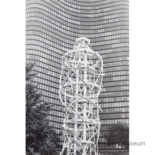 Abstract white sculpture in front of trees and a skyscraper.Acquisition