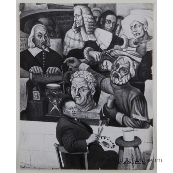Diego Rivera sitting in front of mural at Cardiac Institute in Mexico City Medical Center. He is turned and smiling toward the camera.Acquisition