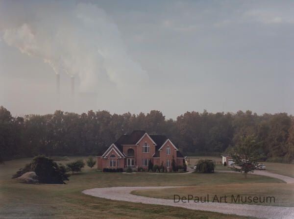 Brick home with gravel driveway, large yard, line of trees in backyard, smoke stacks emitting smoke blending in with the clouds behind the backyard.Acquisition