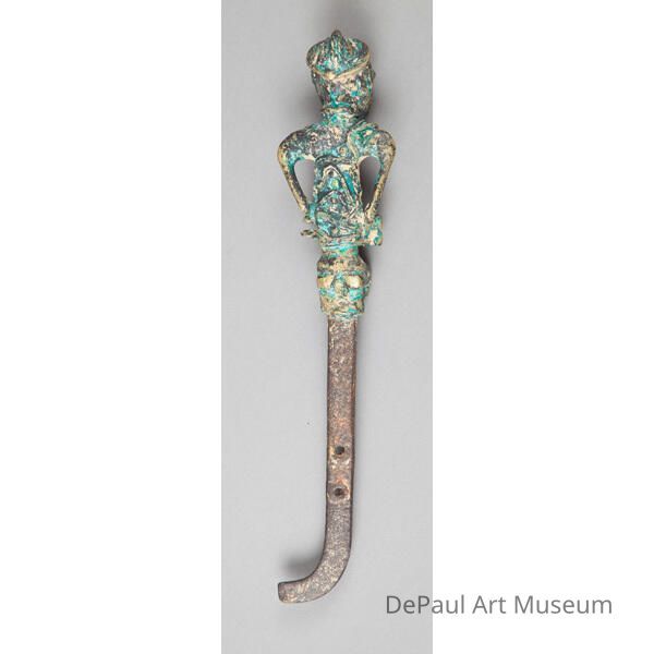 Male figure from Abeokuta on iron poker wearing Ogboni hat showing messenger hair-do, holding pair of personal Edons.Acquisition
