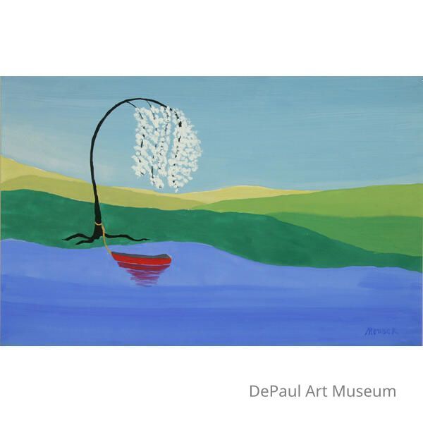 A red boat is in a lake, tied to a tree with white blossoms.  Green hills and a blue sky in the background.Artwork Details