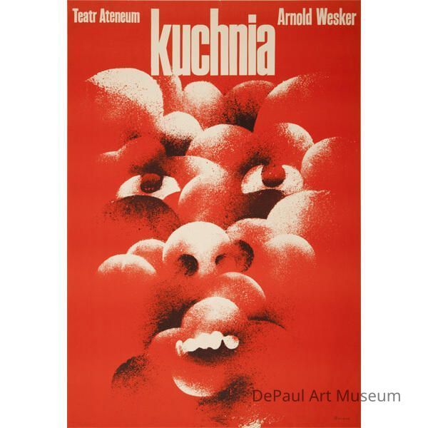 The image of a person's face comprised of abstracted circular shapes. The eyes are looking up and the mouth is agape with teeth visible. Poster is entirely red, with white and black accents. White text at top center and top corners.