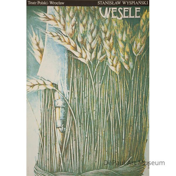 An image of a bundle of wheat with a large wooden handled blade within the bundle. At the top of the poster there is text that says, “Teatr Polski Wrocław: Stanisław Wyspiański: Wesele.” The colors of this poster are mainly light blues and greens, with a little bit of gold.