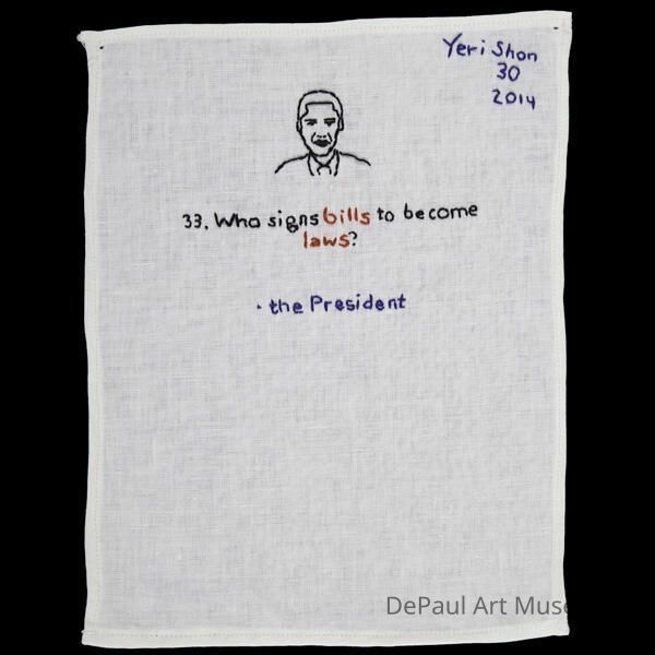 A stitching sampler with the question "who signs bills to become laws?" with a small stitched portrait of Obama.Artwork Details