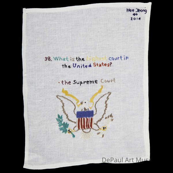 A stitching sampler with an eagle. The sample says "what is the highest court in the United States? The Supreme Court."Artwork Details