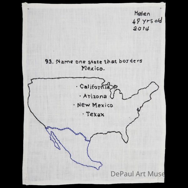 A stitching sampler with the question "Name one state that borders Mexico" with an outline of the U.S. and Mexico.Artwork Details