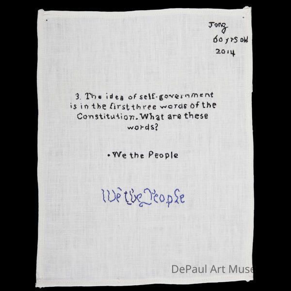 A stitching sampler with the question "the idea od self-government is in the first three words of the Constitution. What are those words?"Artwork Details