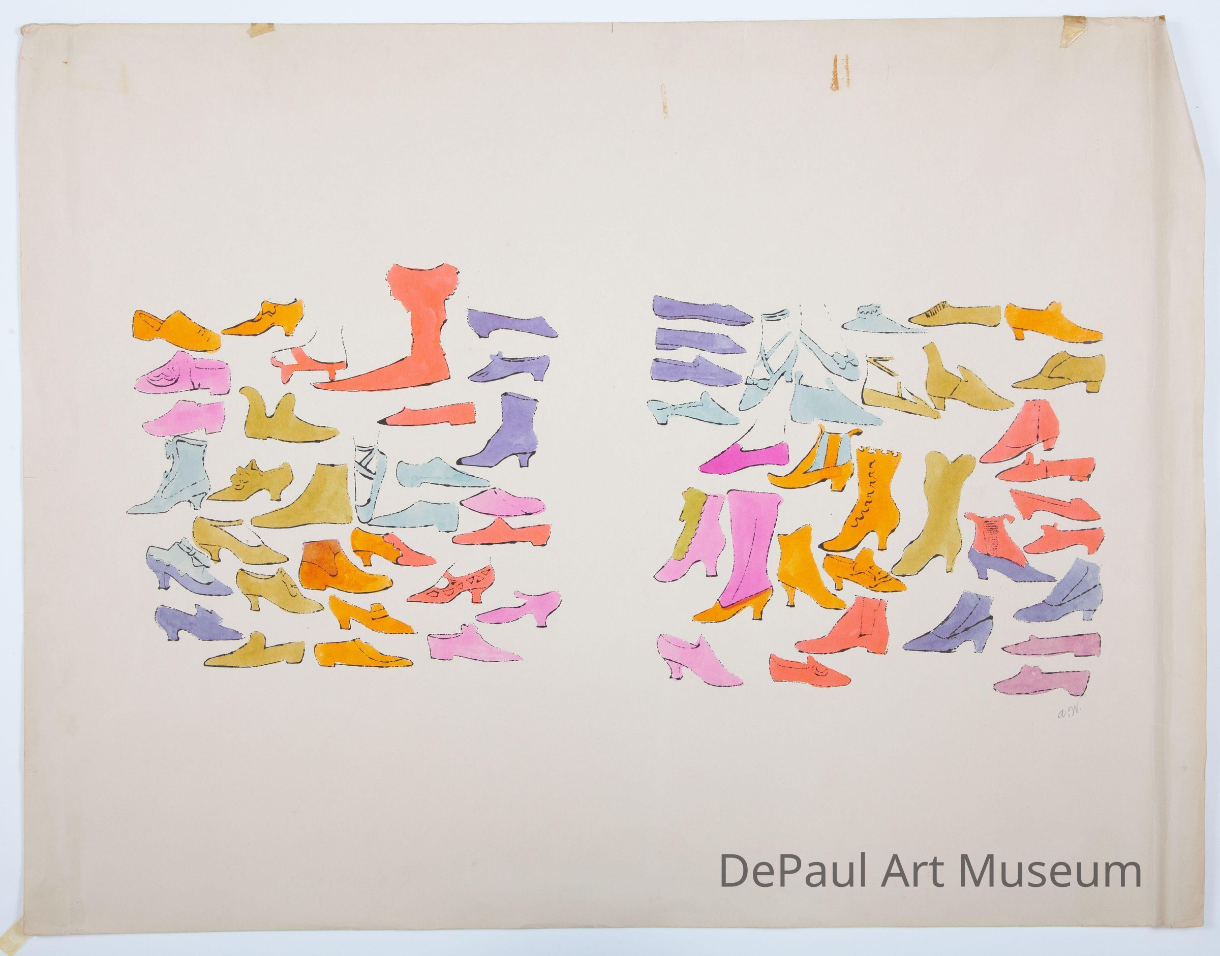The collection of works here date from the early to mid 1950s, the period when Warhol was primarily producing illustrations for the shoe manufacturer Israel Miller. Warhol’s colorful designs depict shoes and boots adorned with gold leaf, embossed foil, and decorative cut outs. Beneath each design is scrawled a pithy phrase or aphorism such as à la recerche du shoe perdue, a reference to Marcel Proust’s magnum opus A la recherche du temps perdu. Other works in this collection depict the chic and fashionable city dwellers Warhol would have seen on the streets and at parties upon first moving to New York. Also included are two early artist’s books. A Is an Alphabet is one of the earliest of such works and features verses penned by Warhol’s friend Corkie (Ralph Thomas Ward). The illustrations are based on tracings Warhol made from photographs in magazines. Love is a Pink Cake, also a collaboration with Corkie, is comprised of 25 sheets, each depicting famous lovers and couples and stands out as an early work where Warhol is forthcoming about his own sexuality.Acquisition