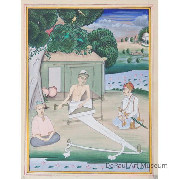 Three men sitting on the ground, one weaving cloth, beside river in rural village surrounded by white borderArtwork Details