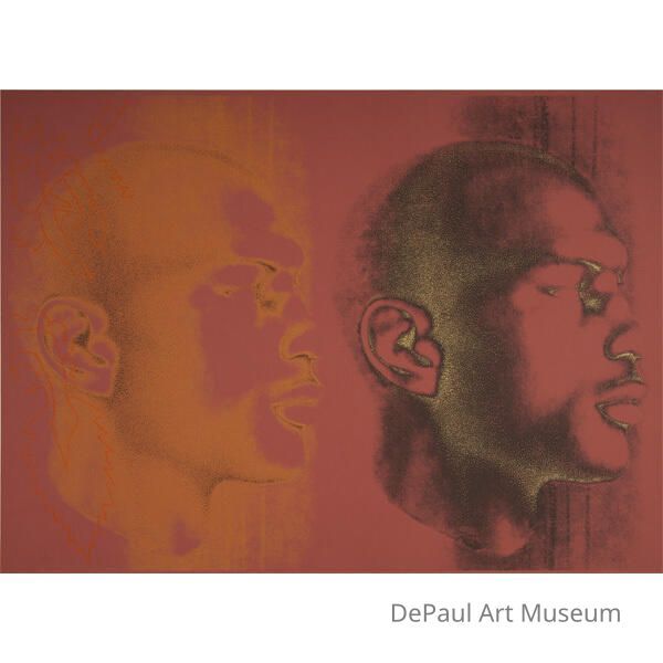 Two Michael Jordan heads profile views, both looking to the viewer's right: Colors; reddish brown, gold, black, orange line shapes on LAcquisition