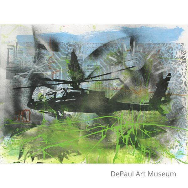 stenciled helicopter on patterned background; green paint splattered throughout bottom section