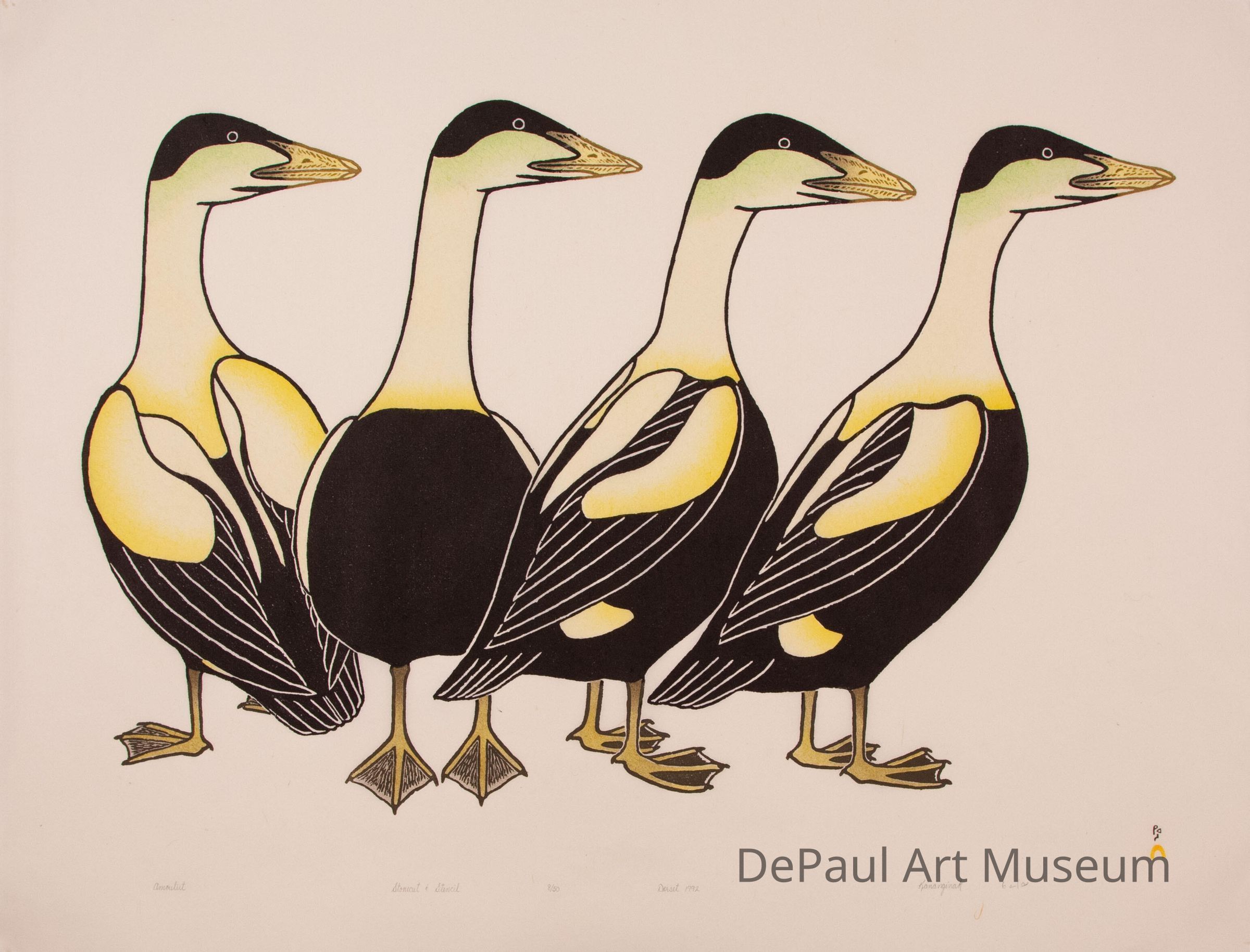 Known in particular for his expertise in representing Arctic wildlife, Kananginak’s specialty was depicting native birds. This work is particularly representative of this latter aspect of Kananginak’s artistic output and is emblematic of the rich stonecut print tradition that still flourishes in Kinngait. Depicted are four King Eider ducks, which are particularly large and well-insulated creatures making them an important food source for the Kinngait peoples.Acquisition