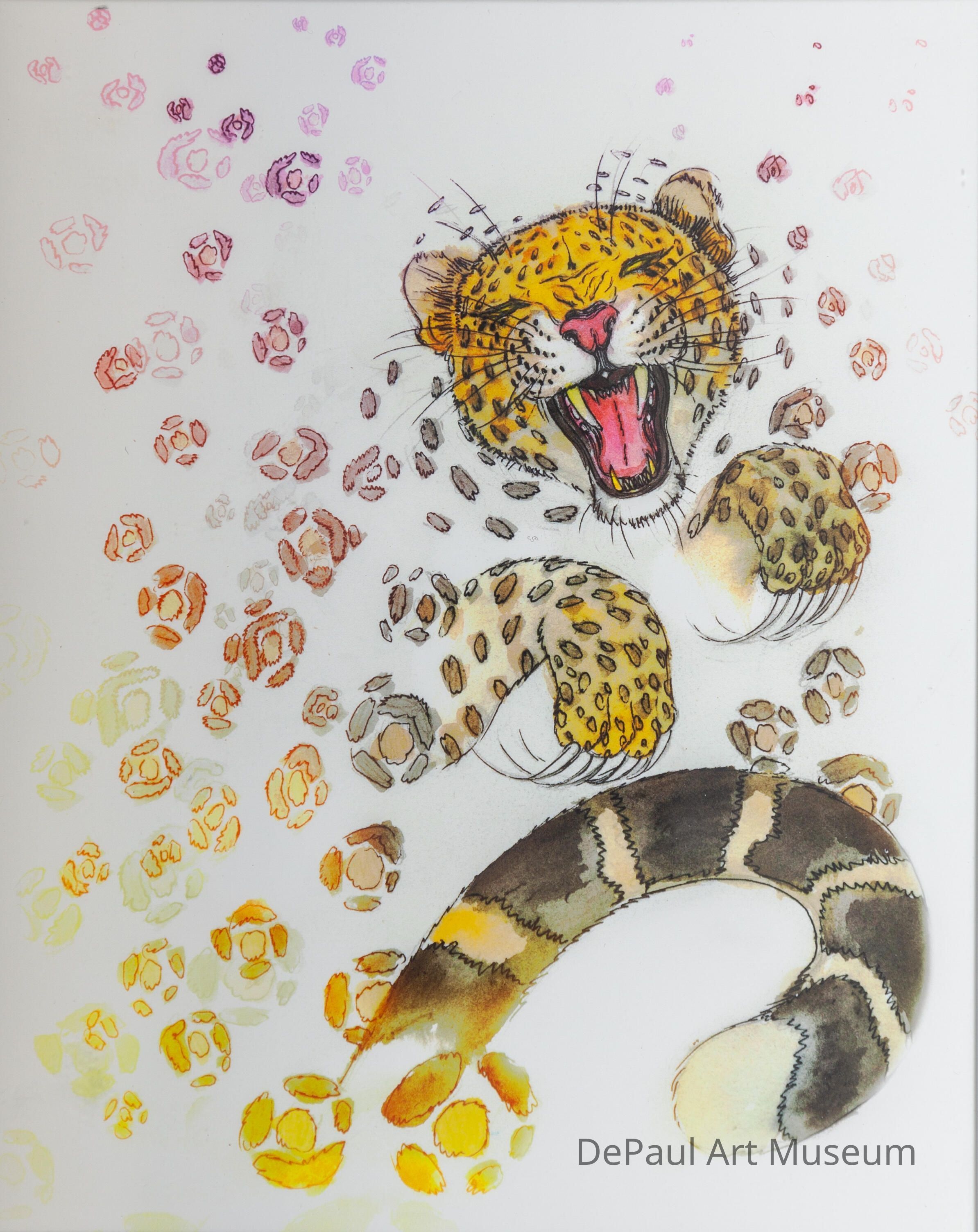 Head, paws, and tails of a leopard. The leopard's mouth is open showing it's tongue and teeth. On the righ side are yellow, orange, and pink flowers.Artwork Details
