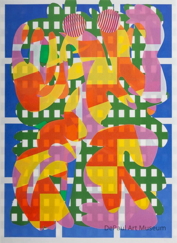 Blue background overlayed with a green grid. On top of grid are abstract shapes in pink, yellow, and orange.Context