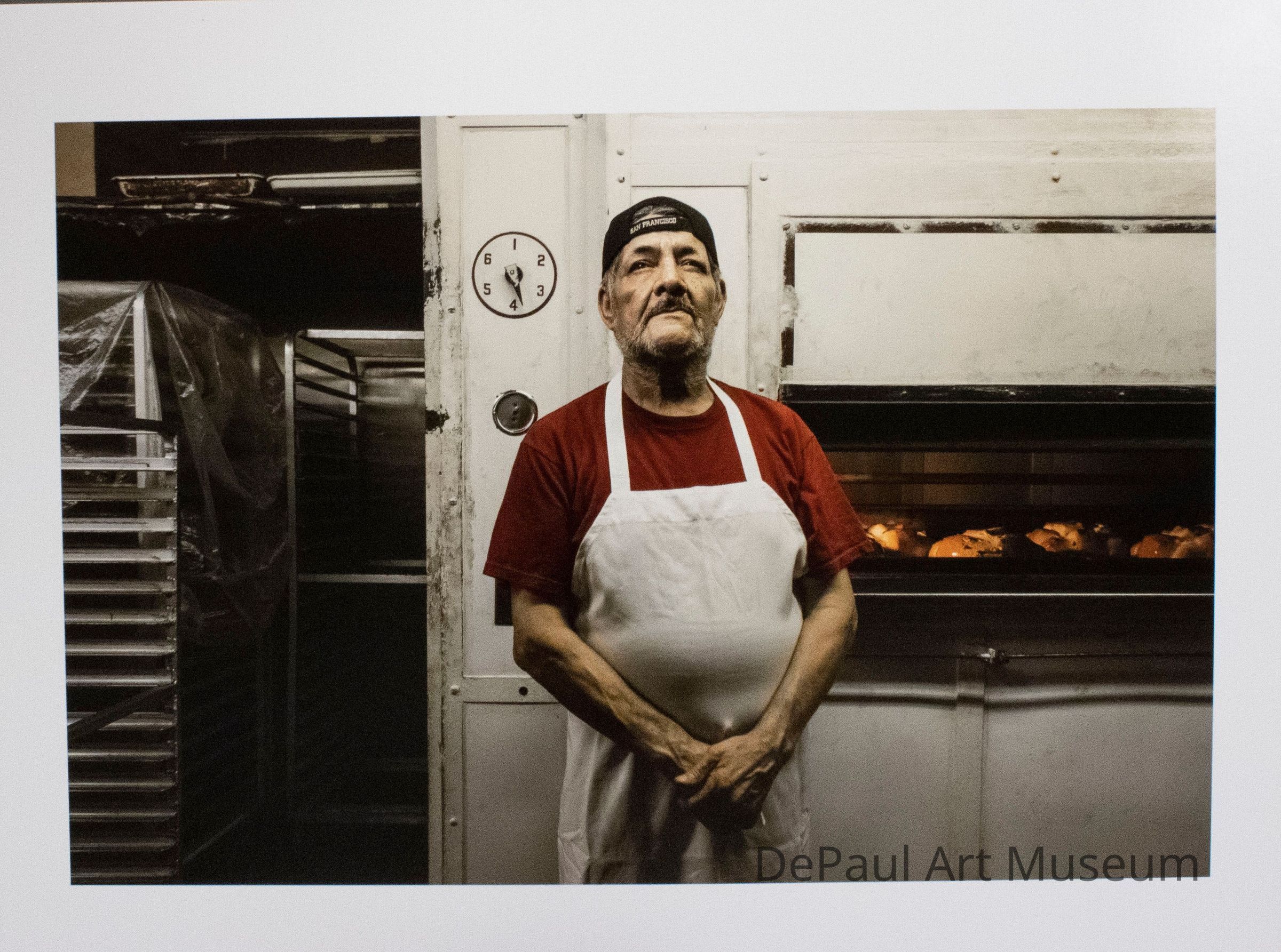 Photograph of Angel inside his bakery, Panaderia El Acambaro in Chicago's Pilsen neighborhood. Angel is in a white apron and standing in front of an oven with bread inside. Angel has passed away since this photo was taken and his daughter and son-in-law now run the business. They serve traditional Mexican sweet breads.Context