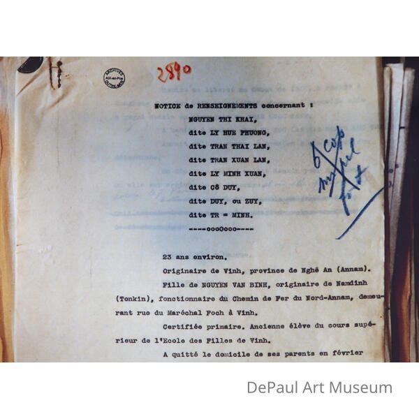 The passport, photographs, and documents from the National Overseas Archives in Aix-enProvence, France, reproduced here depict Nguyễn Thị Minh Khai, one of the most notable women in Vietnamese revolutionary history and the central figure of the exhibition. After years of working with Vietnamese Communist leader Hồ Chí Minh in Hong Kong, she returned to Vietnam to oppose the French government and lead the anti-colonial movement. The French National police captured her in 1940 and executed her by firing squad along with other anti-colonists. While schools, streets, and hotels in Vietnam bear her name, the historical record of Minh Khai is thin and stitched together from bits of information salvaged from French police reports and interrogation documents. Hương Ngô’s research of Minh Khai serves not to close the gaps in the historical record, but to explore the absences and find new ways to tell the impossible stories of gender, colonialism, and violence contained in them.Acquisition