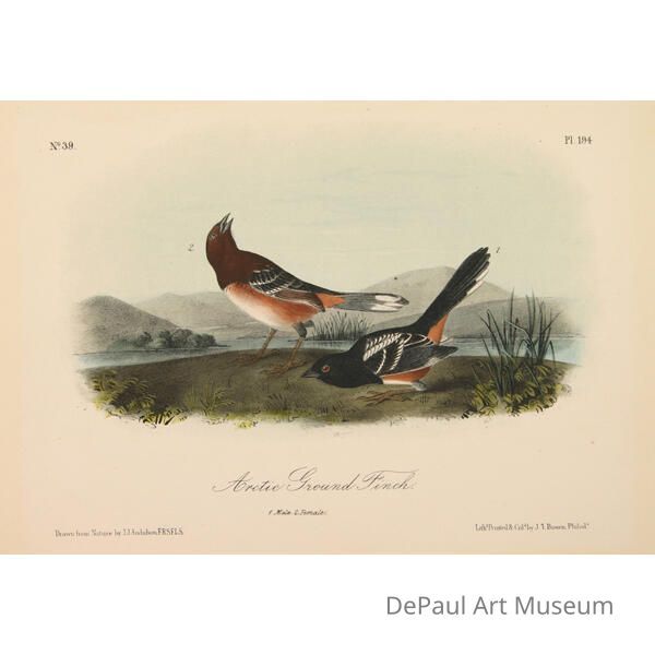 John J. Audubon’s (1785-1851) book ‘Birds of America’ was originally printed with “Double Elephant folio” engravings, meaning 435 life size images of North American birds. Between 1840 and 1869, several editions of a smaller (“octavo”) version of the book were printed. The prints found in DePaul’s collection are from this later era, and were printed by J.T. Bowen in Philadelphia. Bowen used a “camera lucida” to project the large engravings on lithographic stone which was then hand drawn and hand painted using watercolors. These smaller sized books made Audubon’s work accessible to a wider audience, and helped his art gain the reputation it still holds today.Acquisition