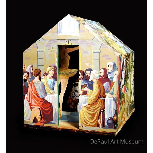 Don Baum was an assemblage artist first and foremost, working the detritus of the vernacular into bristly sculptures and friezes that tweaked the ponderous and pretentious in art history. Around 1979, influenced by a book about medieval peasant life, he began a series of house-shaped sculptures. Utterly simple in form, these explorations of primordial shelter were covered with exuberant collages of travel brochures and copies of Renaissance murals mixed with scraps of old paintings, wallpaper, game boards, and whatever else he could scrounge up in junk shops. In ARF the homey images of paint-by-number hunting scenes and landscapes are somehow harmonized with a painting of the Last Supper, bringing together the subjects of sustenance, humans (and dogs) in nature, and a glimpse of another world.
