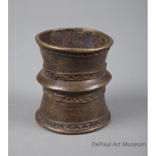 Cylindrical, with four decorative bands of diagonal lines and protruding center ring.Acquisition