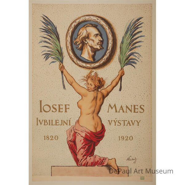 Kneeling Woman holding palms under male profile. Text reads "Iosef Manes, IVBILENTI VYSTAVY, 1820, 1920."