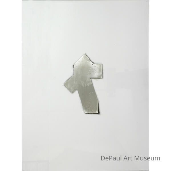 Geometric shape cast in metal, encased in the center of a plexiglass sheet.Artwork Details