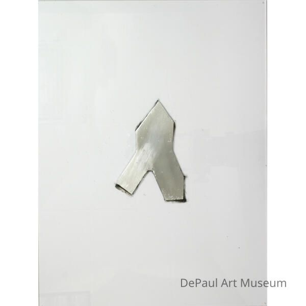 Geometric shape cast in metal, encased in the center of a plexiglass sheet.Artwork Details