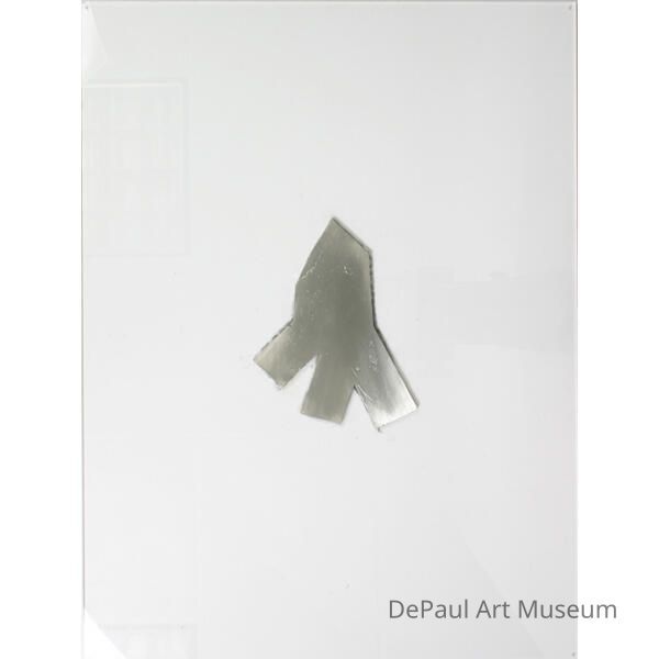 Geometric shape cast in metal, encased in the center of a plexiglass sheet.Artwork Details