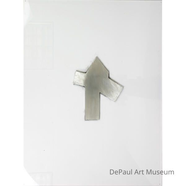 Geometric shape cast in metal, encased in the center of a plexiglass sheet.Artwork Details
