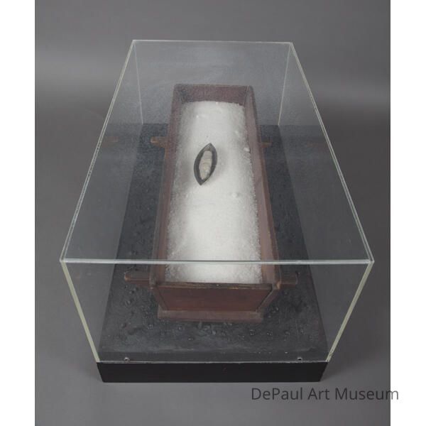 Plexi container over base of black pigment and small vertical black posts. Container for 2016.145a.