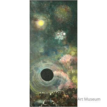 The 1960’s marked the last decade of Julia Thecla’s artistic career and somewhat of a restoration of her place in Chicago’s art world. Thecla thrived in the artistic community of Chicago in the 1930’s and 40’s, but fell to the margins in the 1950’s. She is considered a surrealist painter or a part of the “magic realism” group along with Gertrude Abercrombie and Ivan Albright. While her early work shows more human and animal figures, her later works such as this one, were focused on space. These space themed paintings are thought to have been either a reflection of America’s obsession with the “race for space” at the time, or an escape route for Thecla out of this dimension and into another.Acquisition
