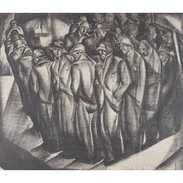 Line of men in trenchcoats and hats done in shaded, angular, slightly Cubist style in grayscaleArtwork Details