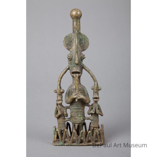 Three figures in hierachy of scale with center figure featured prominently and two smaller figures flanking. Center figure appears to be playing instrument and two other figures holding indistinguishable objects.Acquisition