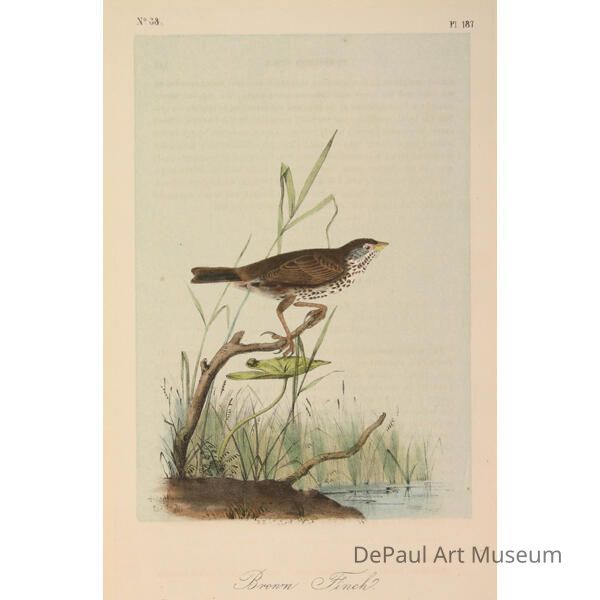John J. Audubon’s (1785-1851) book ‘Birds of America’ was originally printed with “Double Elephant folio” engravings, meaning 435 life size images of North American birds. Between 1840 and 1869, several editions of a smaller (“octavo”) version of the book were printed. The prints found in DePaul’s collection are from this later era, and were printed by J.T. Bowen in Philadelphia. Bowen used a “camera lucida” to project the large engravings on lithographic stone which was then hand drawn and hand painted using watercolors. These smaller sized books made Audubon’s work accessible to a wider audience, and helped his art gain the reputation it still holds today.Acquisition