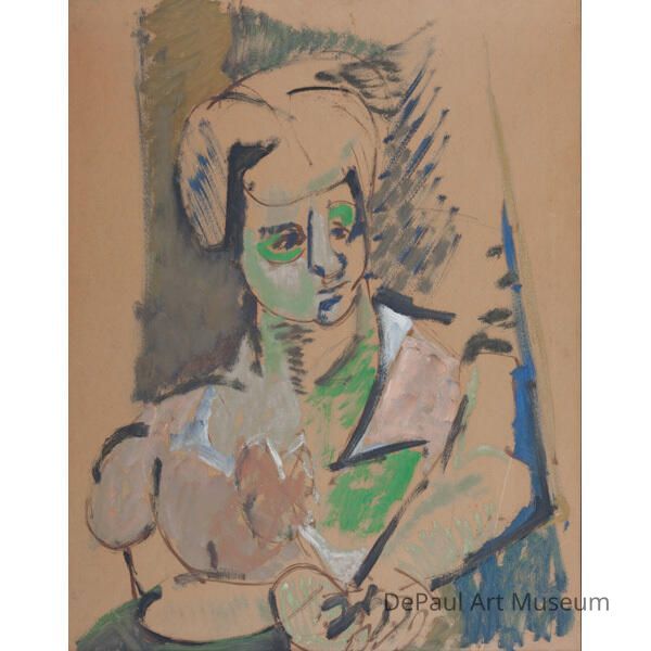 Loosely sketched outline of a woman's face, filled in with green, brown, and blue paint, surrounded by blobs of gray-blueArtwork Details