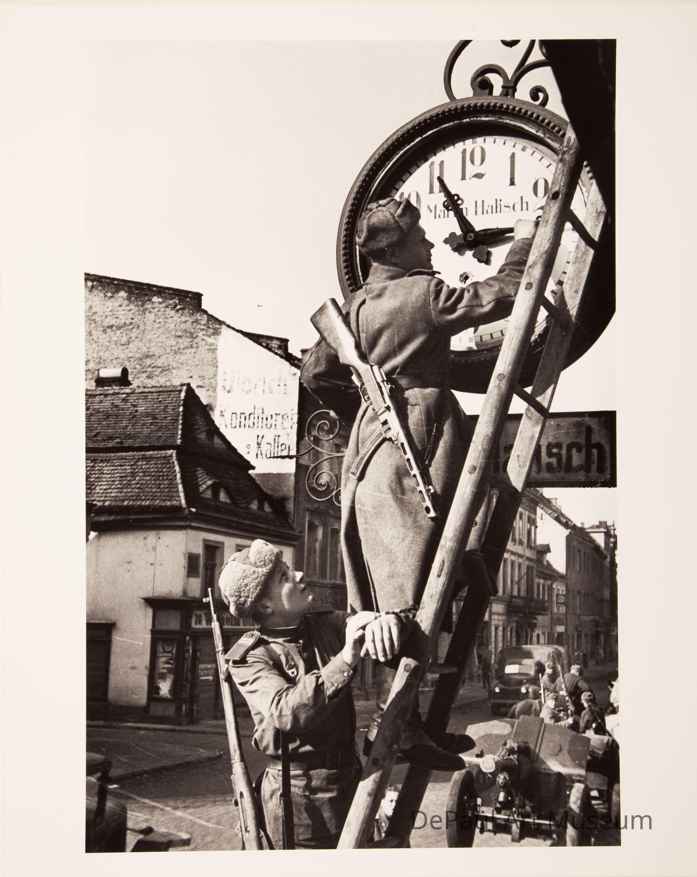 The changing of clocks in Europe started in 1916 during World War I, when clocks starting in the German Empire but soon spreading across the globe were set forward by one hour to begin the world’s first daylight savings time. While initially short-lived, the practice was picked back up again during World War II, when Hitler’s commanders imposed the measure on many of their occupied countries, while Russia had abolished the practice in 1917. In Baltermants 1945 photograph, we see a Soviet soldier standing on a ladder, aided by his compatriot, as he changes the time on a clock in a German city with on-looking Soviet soldiers in the background. Though seemingly a mundane practice, the photograph symbolizes the Soviet occupation of the German town. An official photographer for the Kremlin, Baltermants documented scenes from the Soviet Union’s fight against Nazi Germany during World War II, or “the Great Patriotic War” as it was known in the then USSR.