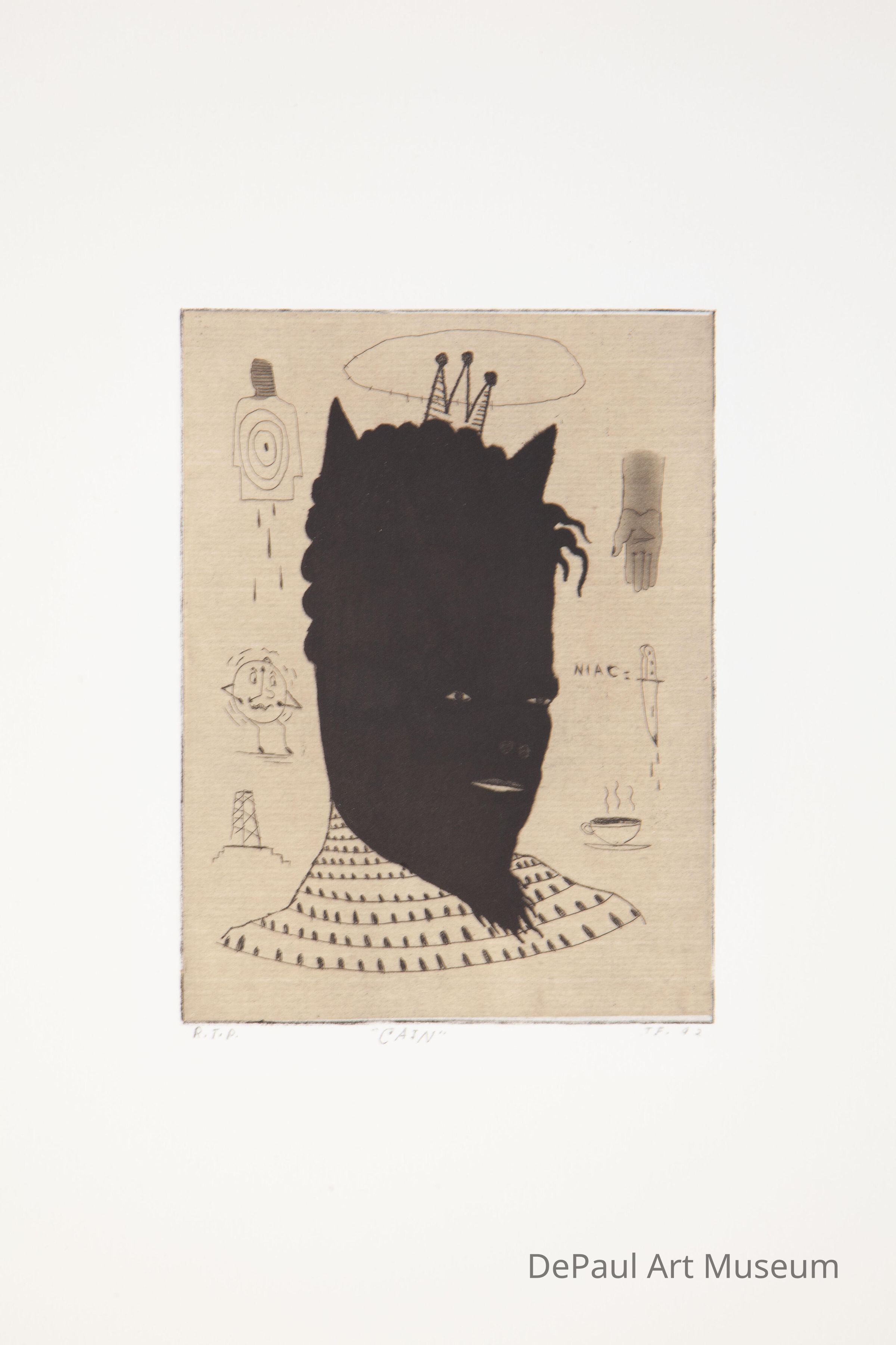 Tony Fitzpatrick’s etching Cain is reminiscent of the artist’s iconic style of using cartoon and tattoo-like design, infused with religious or political imagery or subject matter. In the biblical Old Testament version of the story, Cain is said to have been the eldest son of Adam and Eve, a farmer who offered his crops to God but was rejected in favor of his brother Abel. Cain then proceeded, according to Genesis, to be the first murderer in existence; killing is brother Abel out of jealousy, though the detail and motivations are varied. Other translations of the story liken Cain to the devil himself or an arch- angel, which fits the imagery depicted in Fitzpatrick’s rendering of the biblical character, with its pointed horns and barbed halo and small crown over the figure’s dark head. The symbolic imagery around the figure, in its cartoon-like, enigmatic personifications harkens the symbols and icons to depict versions of the biblical tale without definitive answers, reading more like a tarot card than religious iconography reminiscent of the Renaissance and other periods known for their depictions of these types of stories.