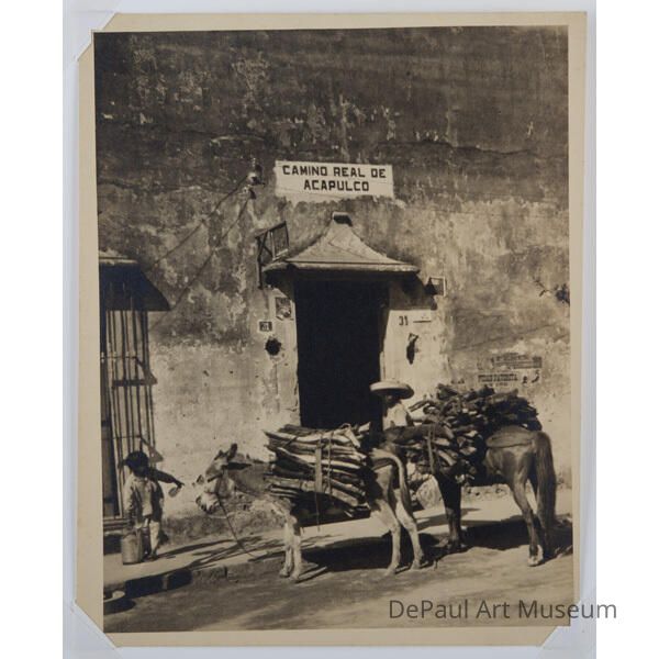 Store front with door, two mules carrying wood and two young people, B&WAcquisition