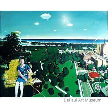 View of Lincoln Park, lake, and portrait of Carol Selle, construction of forms (cut out shapes of chair)