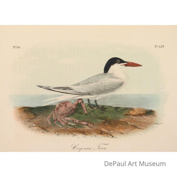 John J. Audubon’s (1785-1851) book ‘Birds of America’ was originally printed with “Double Elephant folio” engravings, meaning 435 life size images of North American birds. Between 1840 and 1869, several editions of a smaller (“octavo”) version of the book were printed. The prints found in DePaul’s collection are from this later era, and were printed by J.T. Bowen in Philadelphia. Bowen used a “camera lucida” to project the large engravings on lithographic stone which was then hand drawn and hand painted using watercolors. These smaller sized books made Audubon’s work accessible to a wider audience, and helped his art gain the reputation it still holds today.Acquisition