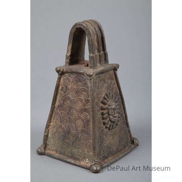 Pyramidal bell with curved handle at top and incised designs of repeated half circles and low relief of a mans face on one side.Acquisition
