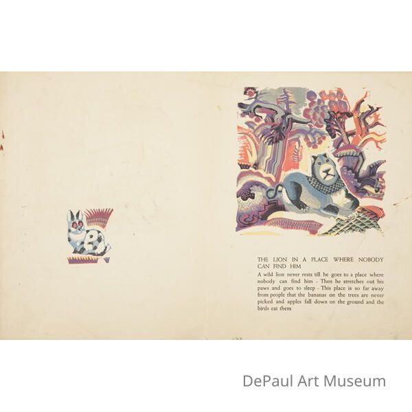 One image of a small rabit and another of a lion laying under trees with a block of text under it.Artwork Details