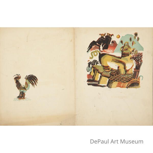 Two images; one of a rooster and the other of a bull/cow with a mountain behind it.Artwork Details
