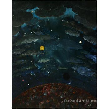 The 1960’s marked the last decade of Julia Thecla’s artistic career and somewhat of a restoration of her place in Chicago’s art world. Thecla thrived in the artistic community of Chicago in the 1930’s and 40’s, but fell to the margins in the 1950’s. She is considered a surrealist painter or a part of the “magic realism” group along with Gertrude Abercrombie and Ivan Albright. While her early work shows more human and animal figures, her later works such as this one, were focused on space. These space themed paintings are thought to have been either a reflection of America’s obsession with the “race for space” at the time, or an escape route for Thecla out of this dimension and into another.Acquisition