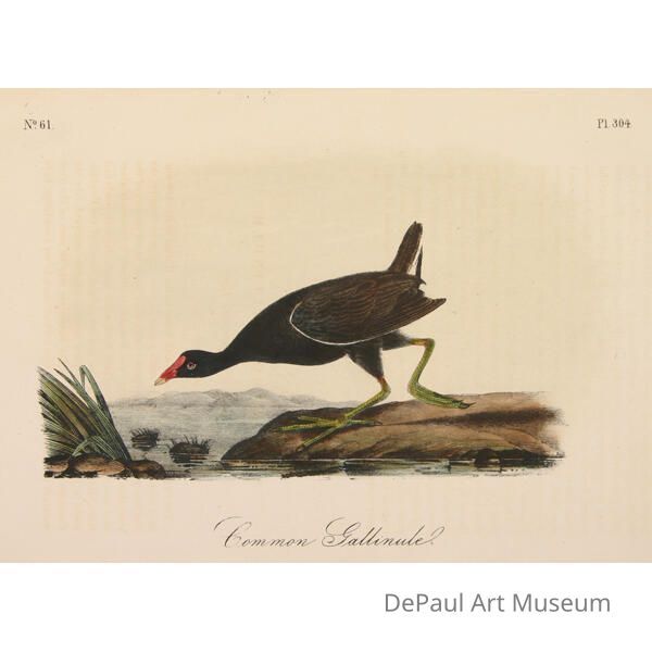 John J. Audubon’s (1785-1851) book ‘Birds of America’ was originally printed with “Double Elephant folio” engravings, meaning 435 life size images of North American birds. Between 1840 and 1869, several editions of a smaller (“octavo”) version of the book were printed. The prints found in DePaul’s collection are from this later era, and were printed by J.T. Bowen in Philadelphia. Bowen used a “camera lucida” to project the large engravings on lithographic stone which was then hand drawn and hand painted using watercolors. These smaller sized books made Audubon’s work accessible to a wider audience, and helped his art gain the reputation it still holds today.Acquisition