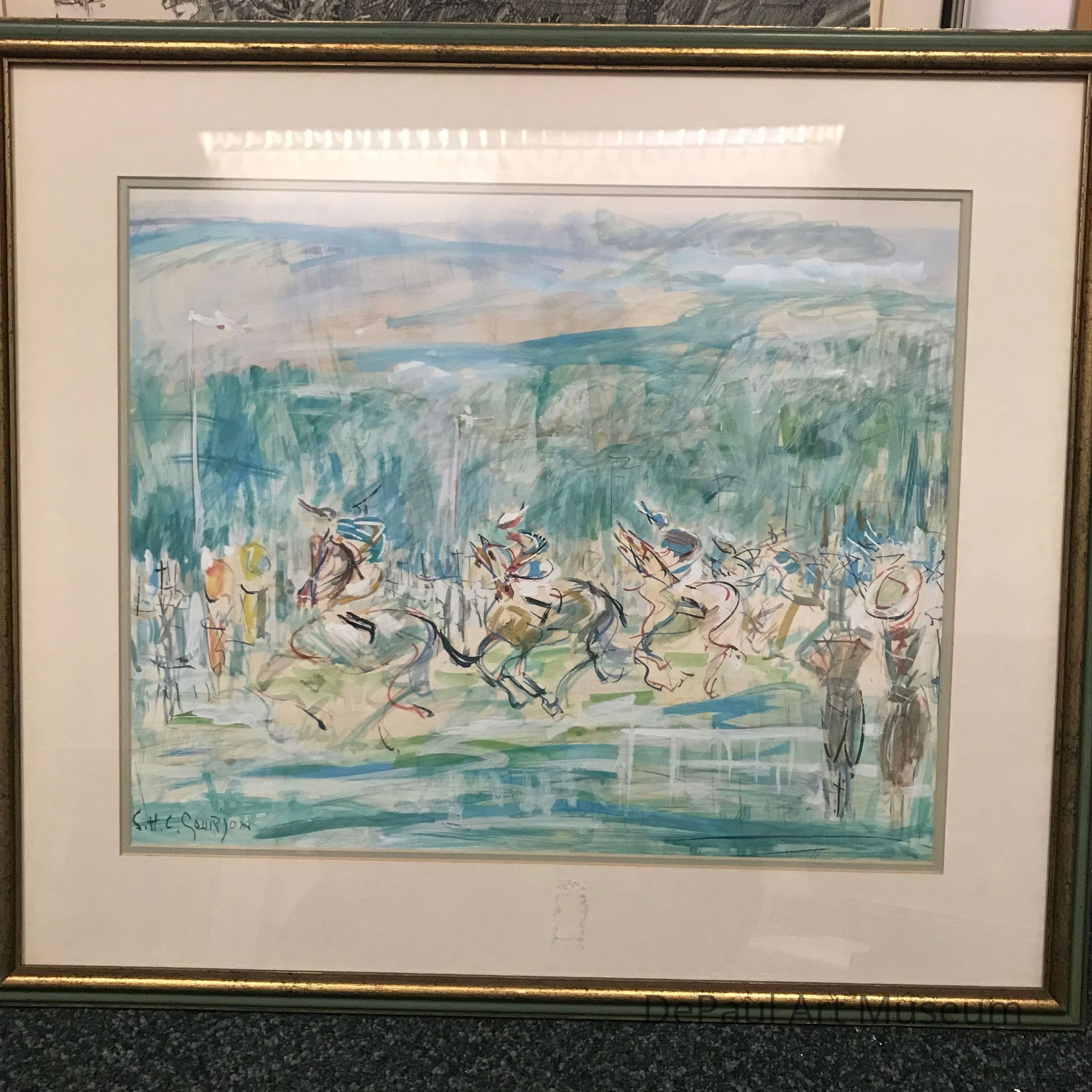 Abstracted scene in pastel colors, predominantly blue and green, of horses running and onlookers, done in hasty/loosely formed technique with flowing and curvilinear lines.Artwork Details