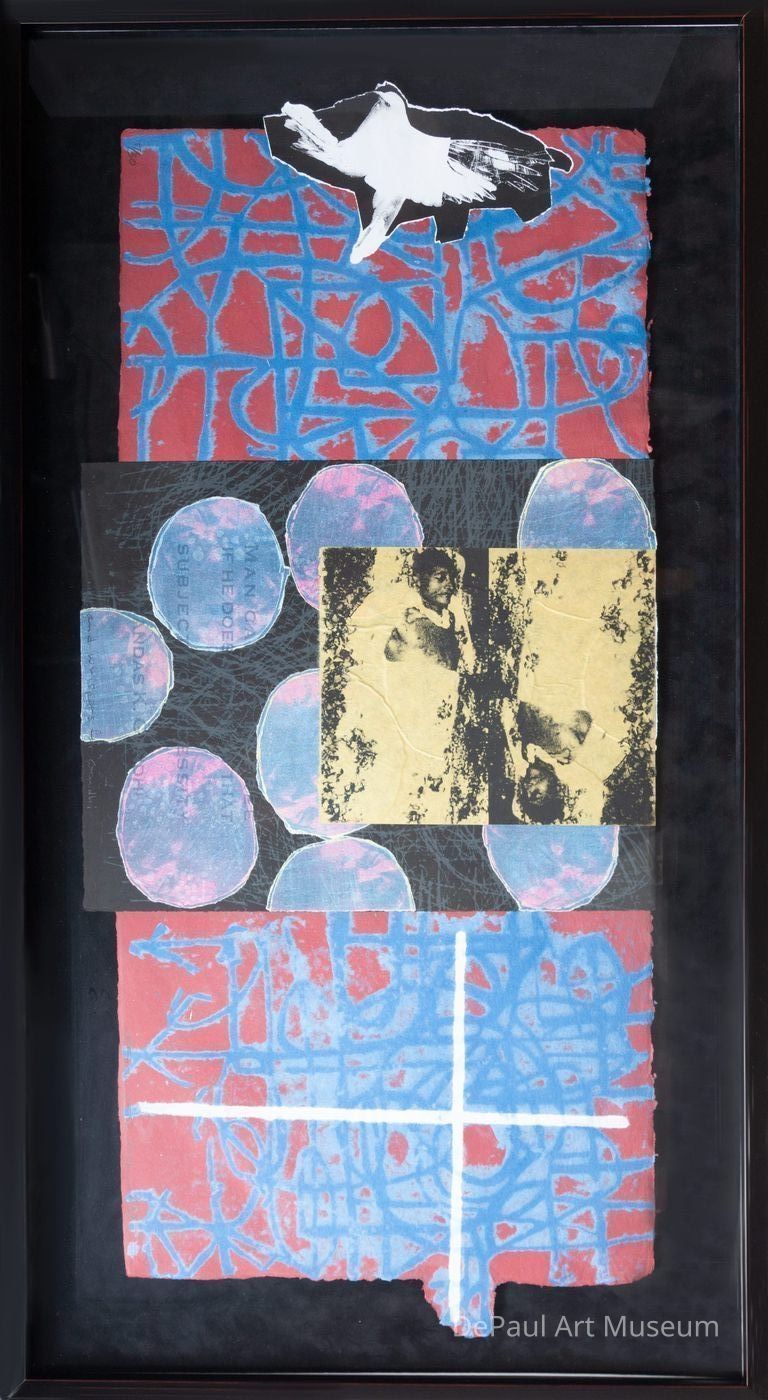 Collage type work with two matching sections on the top and bottom of a red background with blue swirly lines. Middle section has large multicolored circles next to a square image in yellow of a figure. A white cross shape is at the bottom and a white bird photo is at the top.Artwork Details